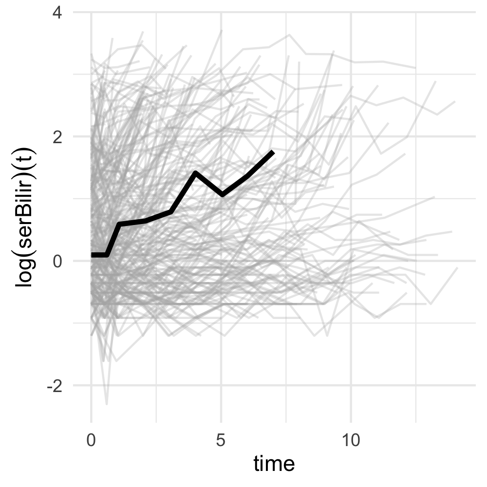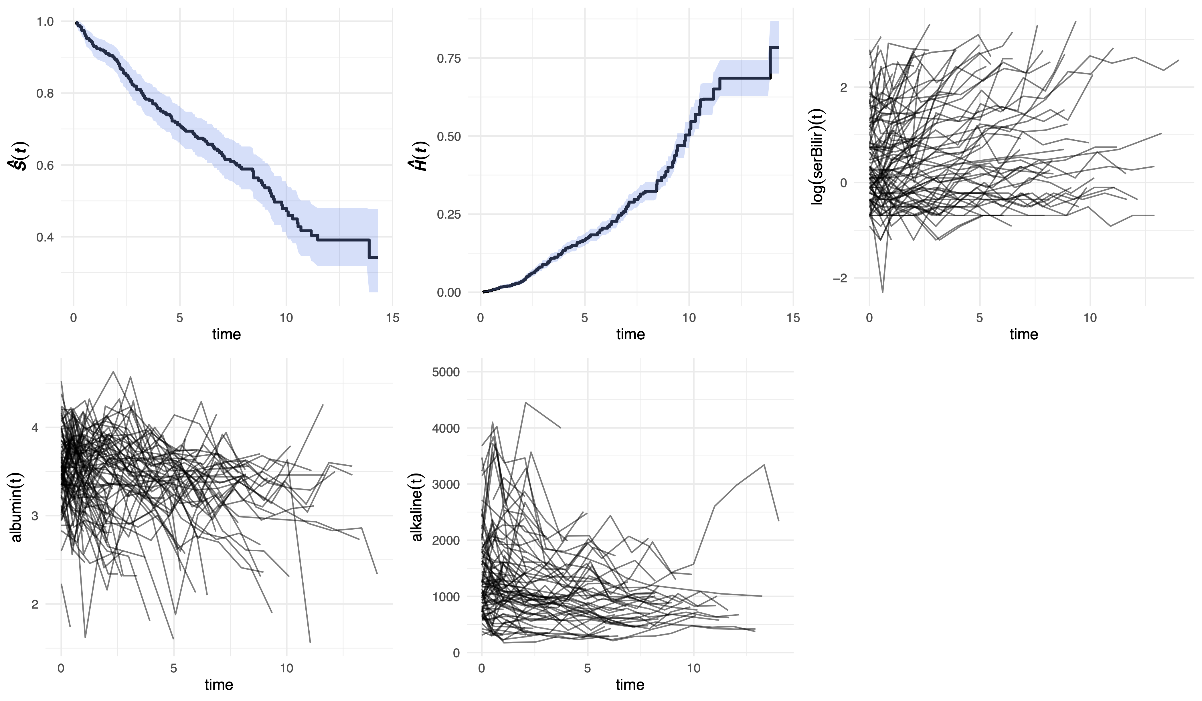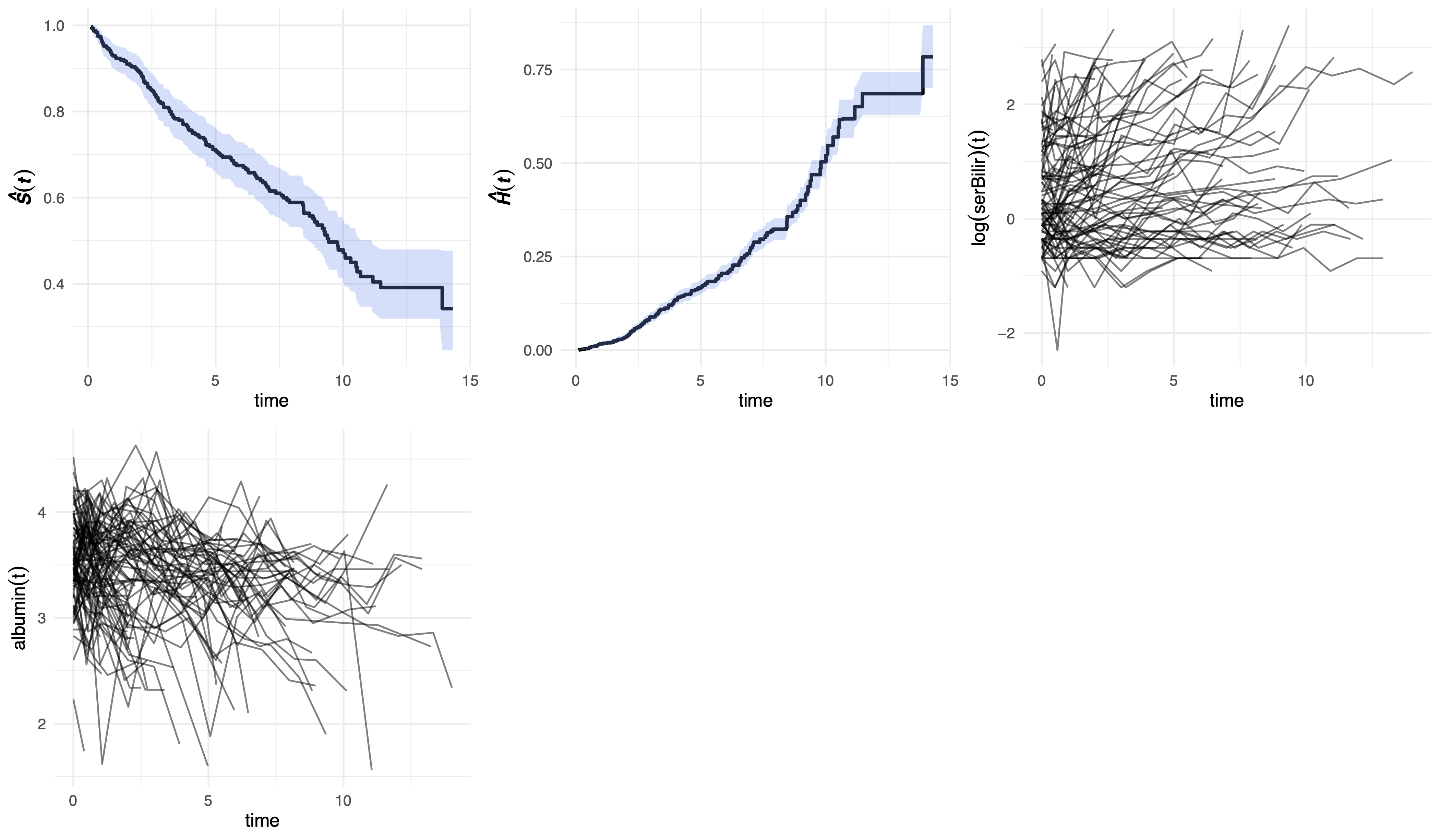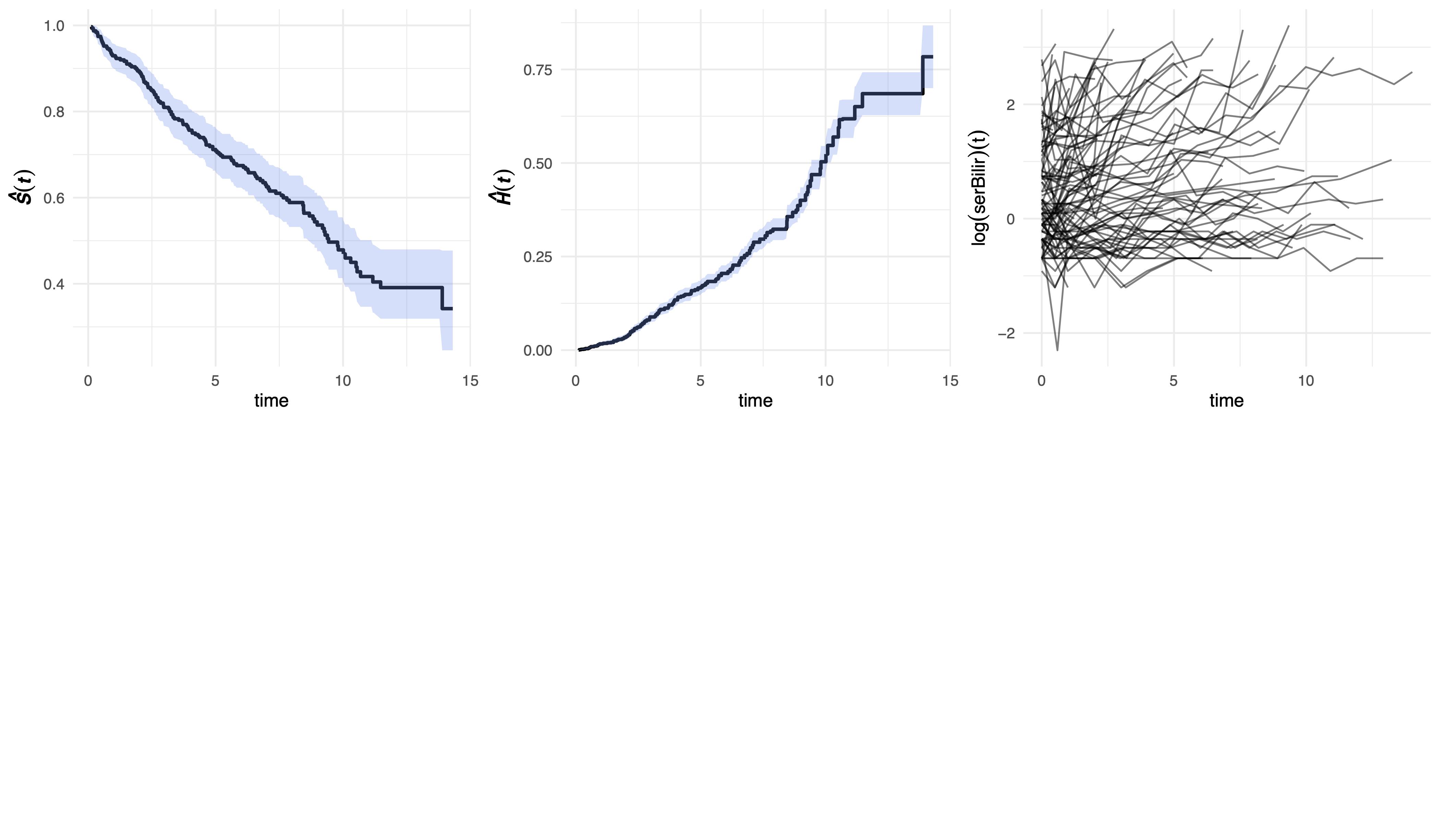 \[\require{color}\color{#D2691E}\scriptsize{\begin{split} &(y_{1i}(t_{ij}), y_{2i}(t_{ij}) , y_{3i}(t_{ij})) = \\ (\log(\texttt{serBilir})_i&(t_{ij}), \texttt{albumin}_i(t_{ij}), \texttt{alkaline}_i(t_{ij})) \end{split}}\]