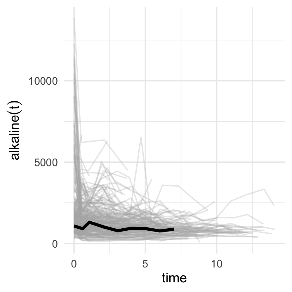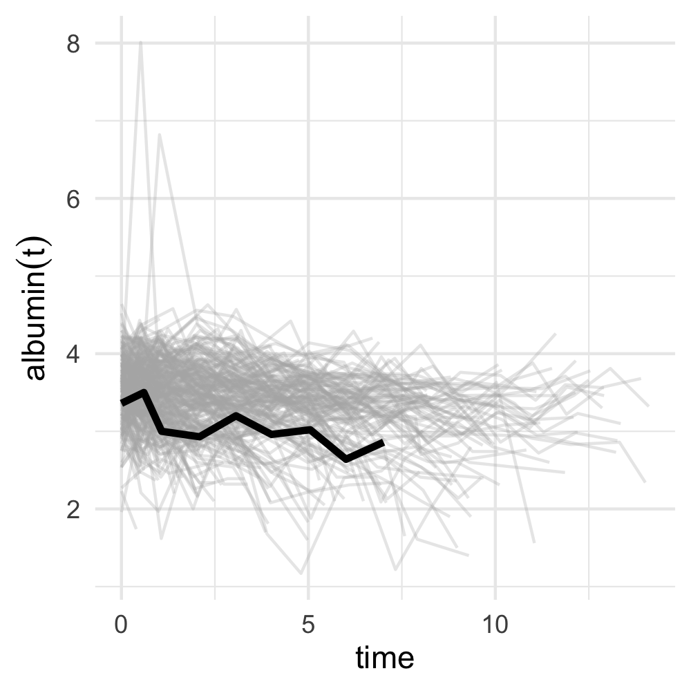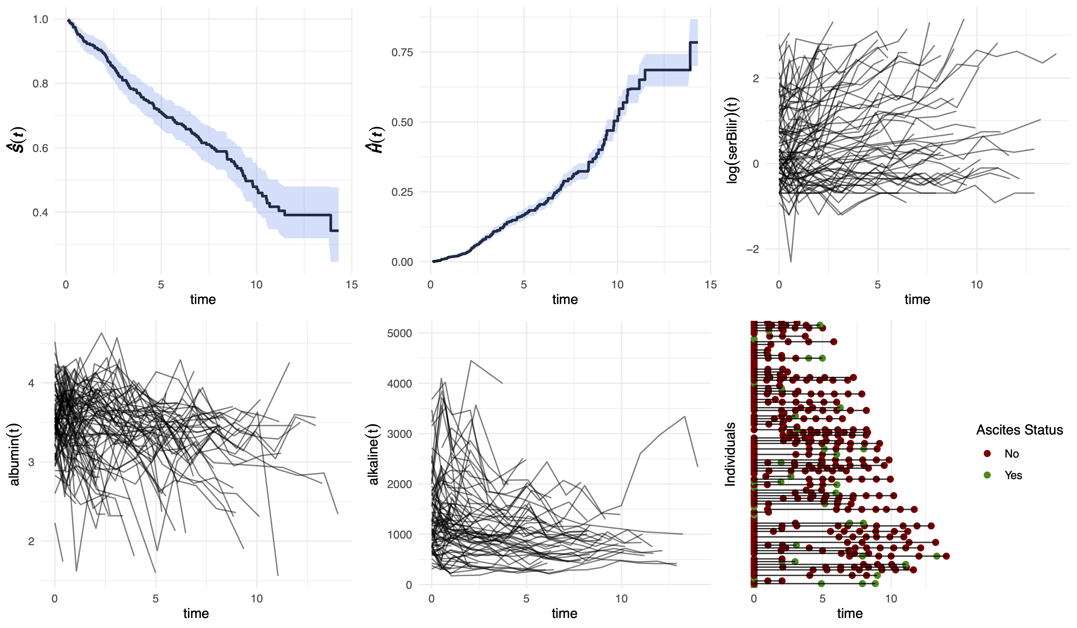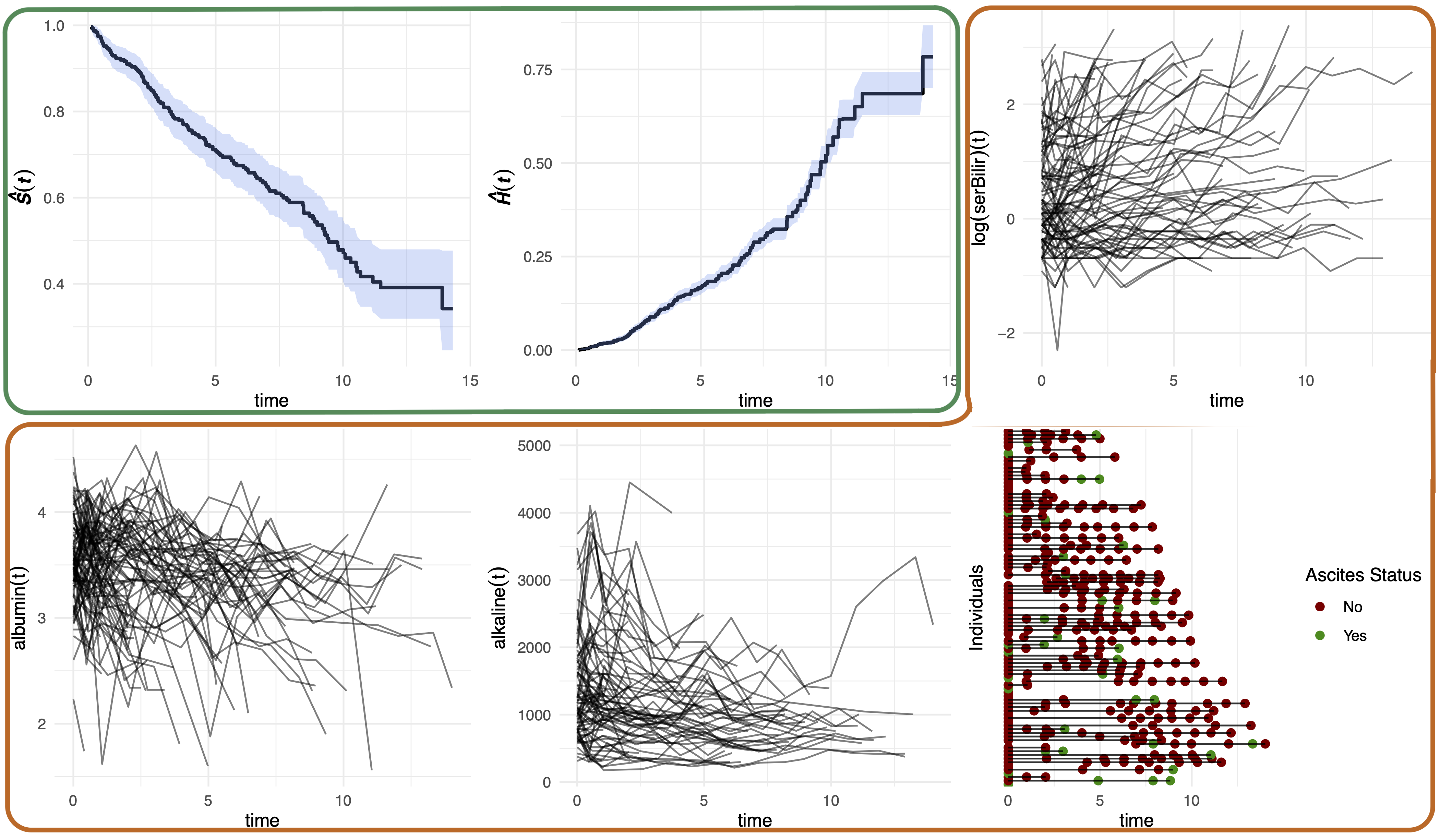 \[\require{color}\color{#D2691E}\scriptsize{\begin{split} &(y_{1i}(t_{ij}), y_{2i}(t_{ij}) , y_{3i}(t_{ij})) = \\ (\log(\texttt{serBilir})_i&(t_{ij}), \texttt{albumin}_i(t_{ij}), \texttt{alkaline}_i(t_{ij})) \end{split}}\]