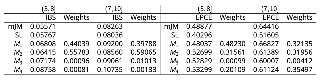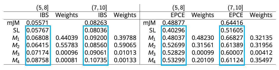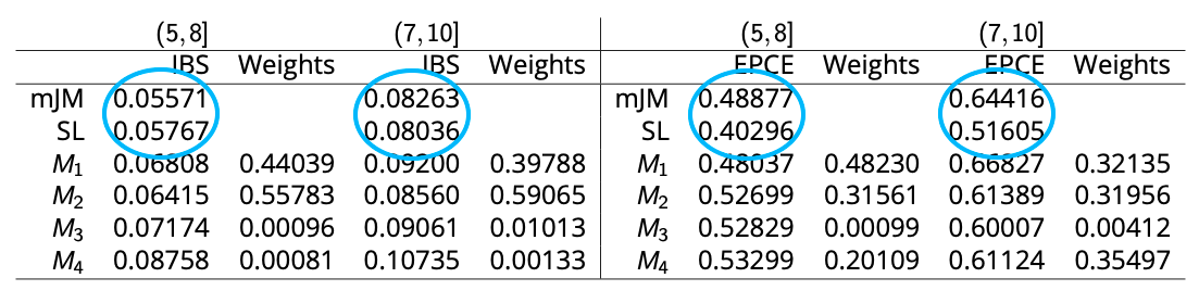 \[\scriptsize\begin{cases} M1: & h_{i}\left(t \mid \colorbox{#D2691E}{$\color{white}\boldsymbol{\mathcal{Y}}_{i}(t)$}, \colorbox{#2E8B57}{$\color{white}\boldsymbol{w}_{i}$}\right) =h_{0}(t) \exp \big( \colorbox{#2E8B57}{$\color{white}\gamma\texttt{drug}_i$}+ \alpha_1\colorbox{#D2691E}{$\color{white}m_{1i}(t_{ij})$} \big) \\ M2: & h_{i}\left(t \mid \colorbox{#D2691E}{$\color{white}\boldsymbol{\mathcal{Y}}_{i}(t)$}, \colorbox{#2E8B57}{$\color{white}\boldsymbol{w}_{i}$}\right) =h_{0}(t) \exp \big( \colorbox{#2E8B57}{$\color{white}\gamma\texttt{drug}_i$}+ \alpha_2\colorbox{#D2691E}{$\color{white}m_{2i}(t_{ij})$} \big) \\ M3: & h_{i}\left(t \mid \colorbox{#D2691E}{$\color{white}\boldsymbol{\mathcal{Y}}_{i}(t)$}, \colorbox{#2E8B57}{$\color{white}\boldsymbol{w}_{i}$}\right) =h_{0}(t) \exp \big( \colorbox{#2E8B57}{$\color{white}\gamma\texttt{drug}_i$}+ \alpha_3\colorbox{#D2691E}{$\color{white}m_{3i}(t_{ij})$} \big) \\ M4: & h_{i}\left(t \mid \colorbox{#D2691E}{$\color{white}\boldsymbol{\mathcal{Y}}_{i}(t)$}, \colorbox{#2E8B57}{$\color{white}\boldsymbol{w}_{i}$}\right) =h_{0}(t) \exp \big( \colorbox{#2E8B57}{$\color{white}\gamma\texttt{drug}_i$}+ \alpha_4\colorbox{#D2691E}{$\color{white}m_{4i}(t_{ij})$} \big) \end{cases}\]